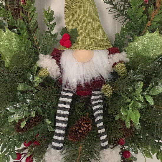 - A high quality plush gnome measuring 14" tall is the focal point of the wreath. Dressed in a festive green and red outfit with Christmas holly on his hat.