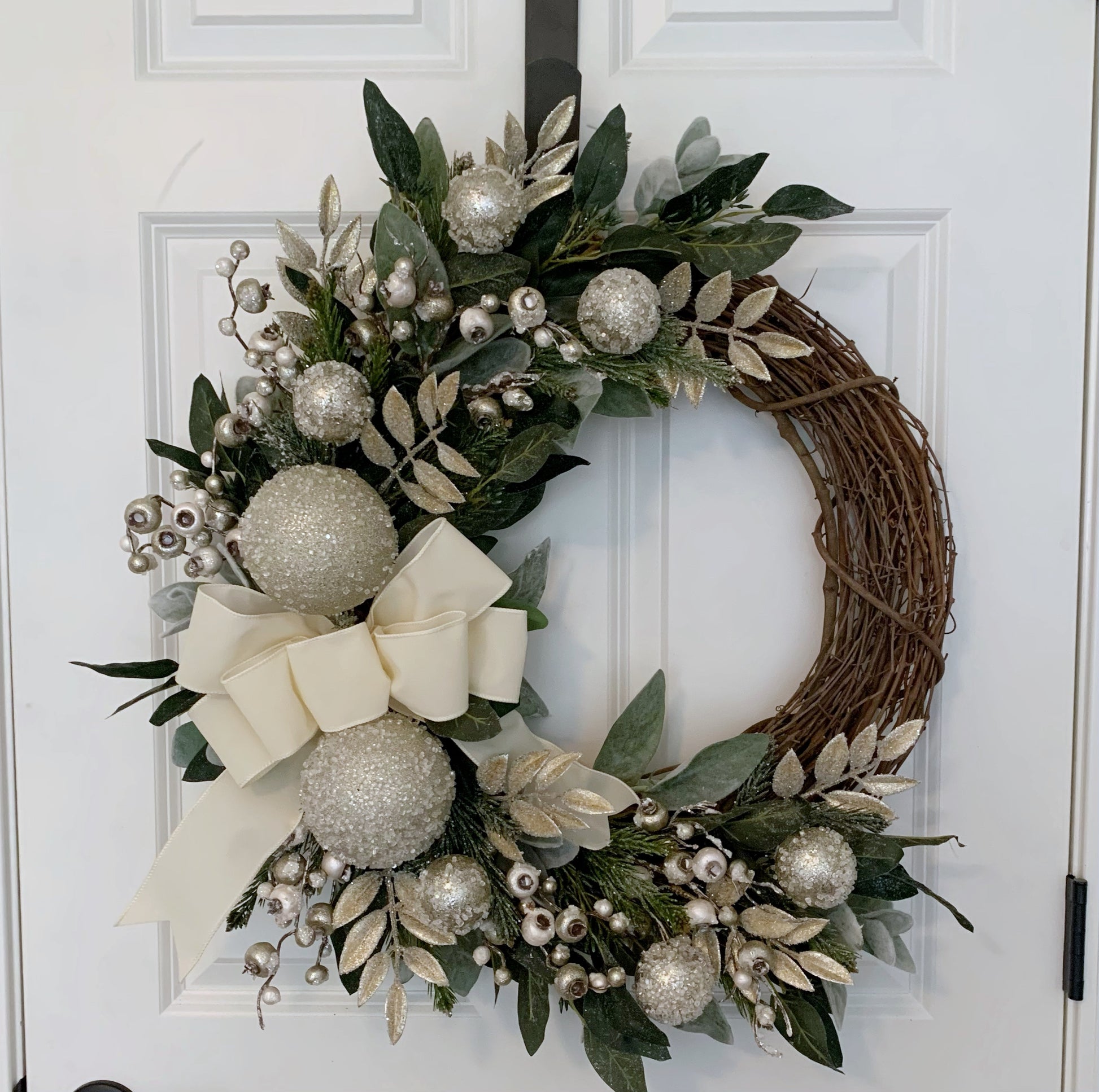 This Christmas Wreath for you front door is the perfect combination of modern elegance and holiday glamour. It's use of natural elements such as iced eucalyptus and pine create a beautiful backdrop for stylish gold, silver and pearl decor.