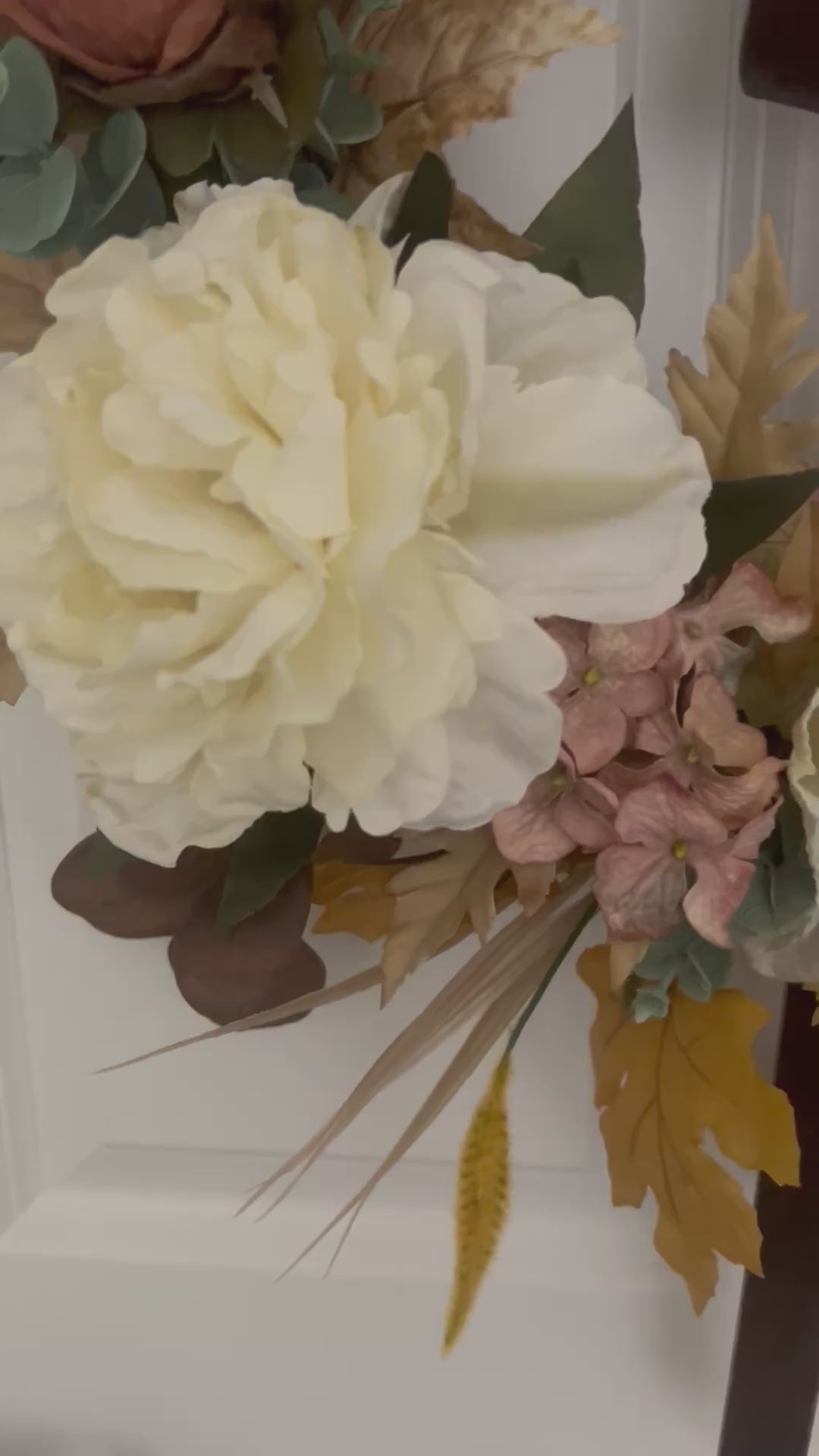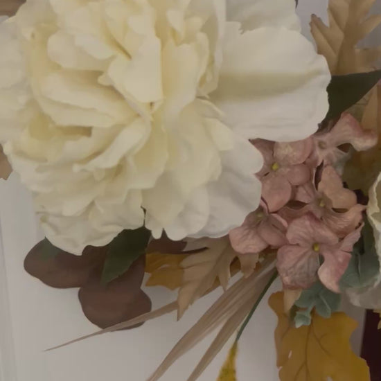 • Natural Autumn Texture: Brown eucalyptus, cream maple leaves, and golden fall foliage create a beautifully balanced design.