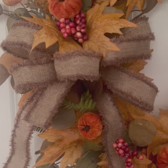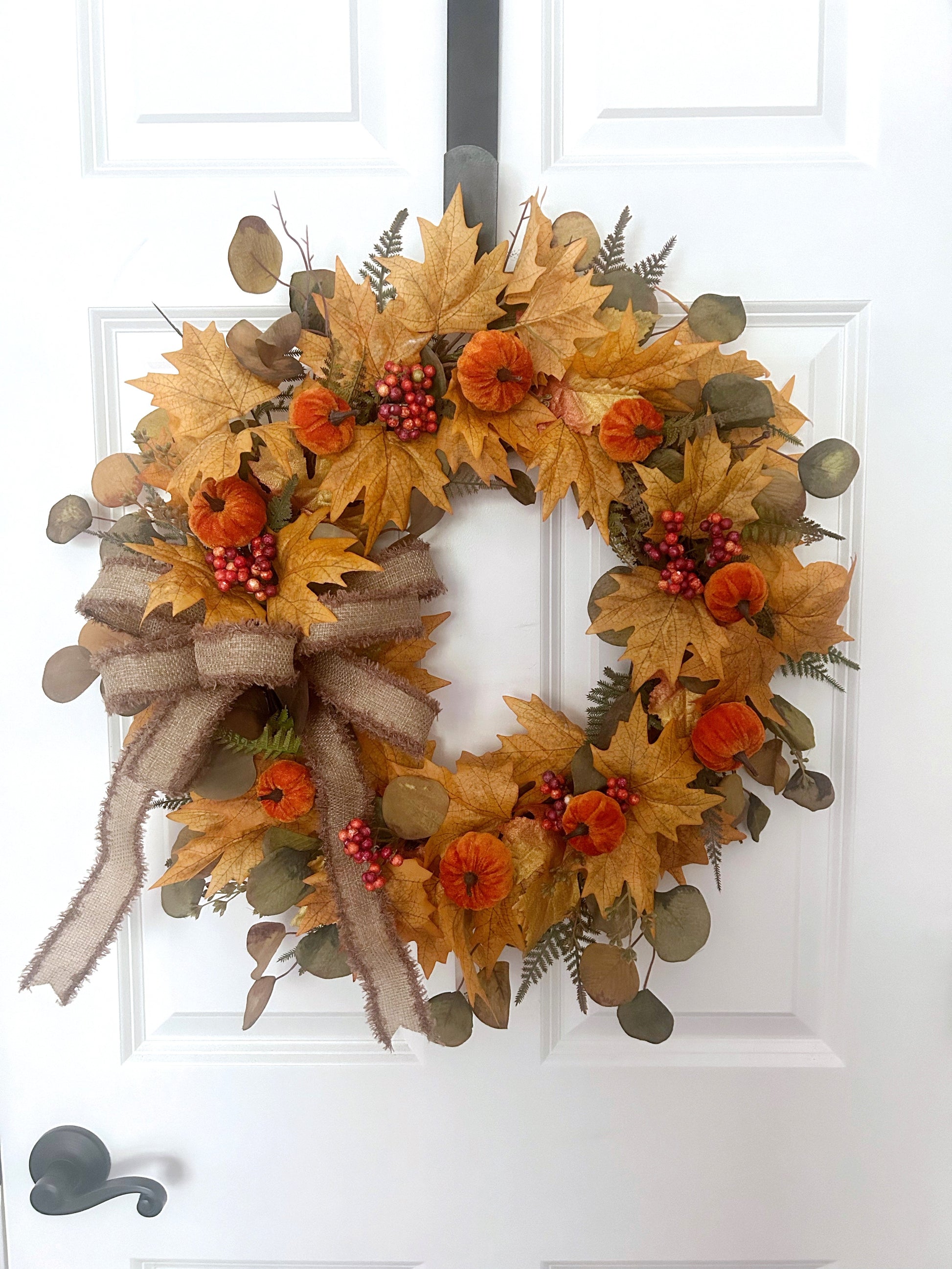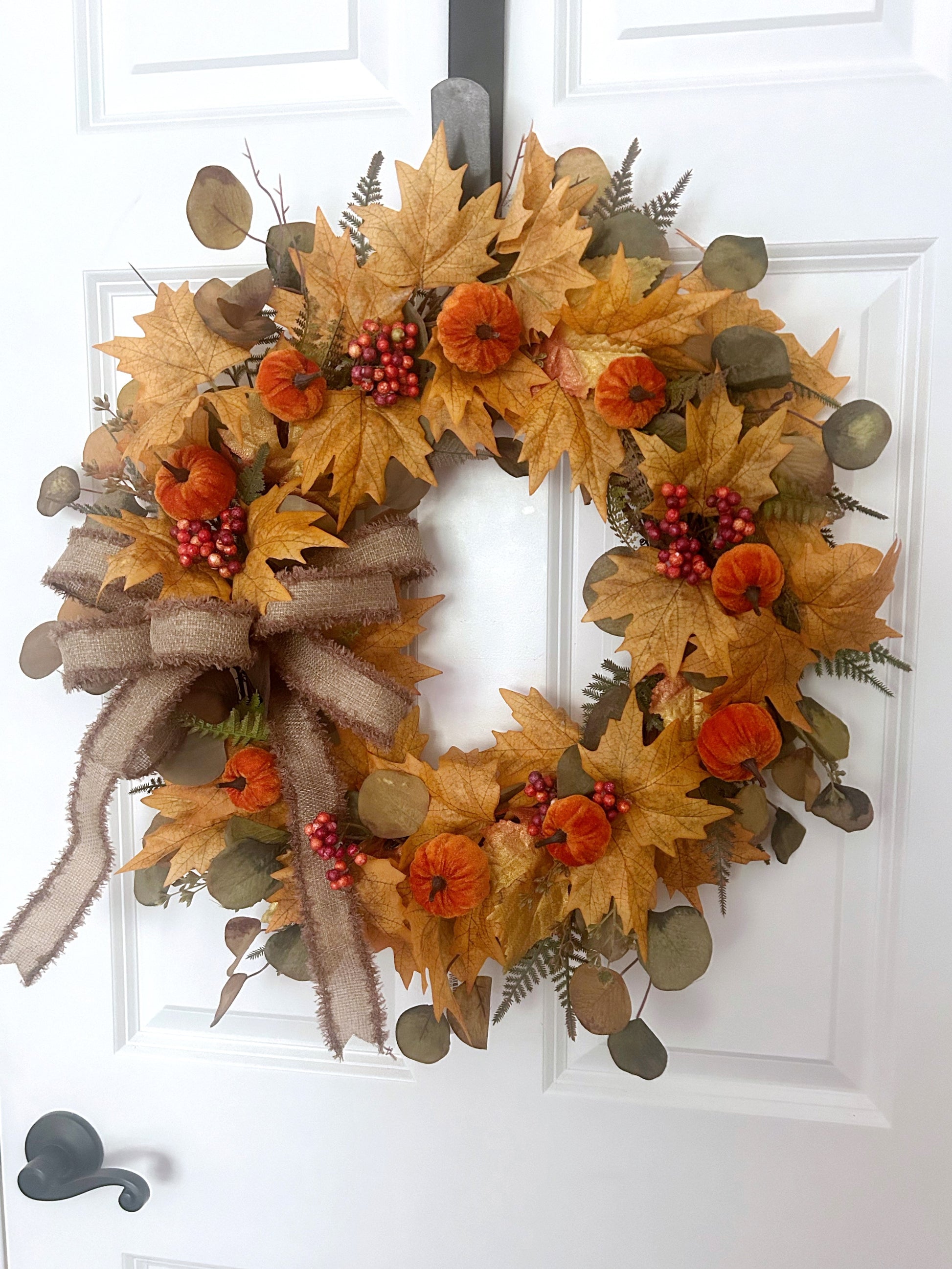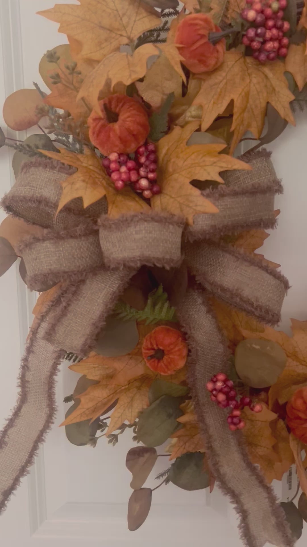 - Mixture of fall maple leaves, eucalyptus and berries add seasonal flair and fall color to the wreath